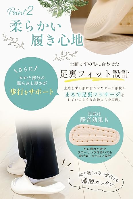 【履き心地の良さ】土踏まずの形に合わせてかかと部分に膨らみがあるので足にフィットします。スリッパを室内で脱いだり履いたりしやすい形状です。