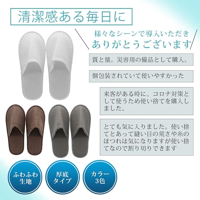 【特徴】3色展開の個包装された使い捨てスリッパ。さわり心地の良いふわりとした生地を使用し、足裏に負担のない厚底タイプ。前閉じ仕様で歩行時に衛生的であり、避難所・病院などでも気兼ねなく利用できます。汚れの目立たないカラーも展開。