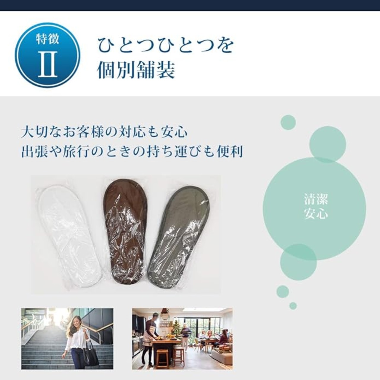 【個包装で多様な利用シーン】大切なお客様の対応も安心できる、衛生的な個包装タイプ。出張や旅行のときの持ち運びにも便利です。ホテルや宿泊施設でのご利用のほか、不動産の内見、体育館や公民館、避難所での利用、学校での活用などに幅広くお使いいただけます。