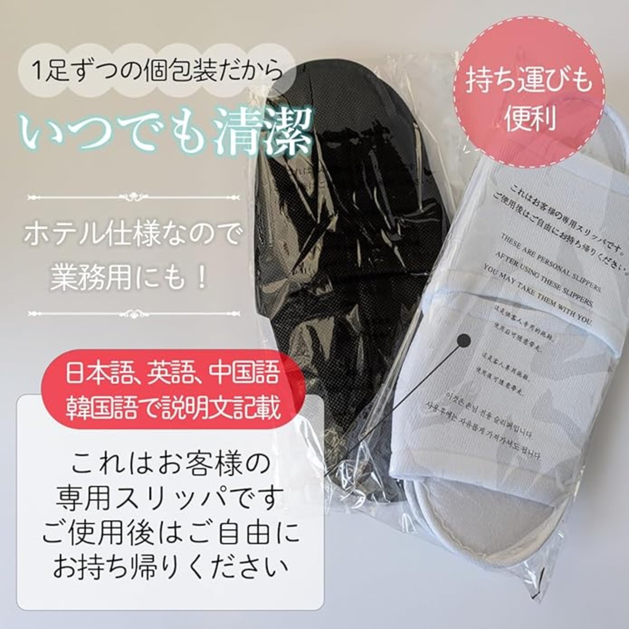 ✅品質と価格を追求したホテル仕様の使い捨てスリッパ。個包装だからいつも清潔。業務用として、来客用スリッパとして、機内用スリッパとして幅広い用途にお使いいただけます。