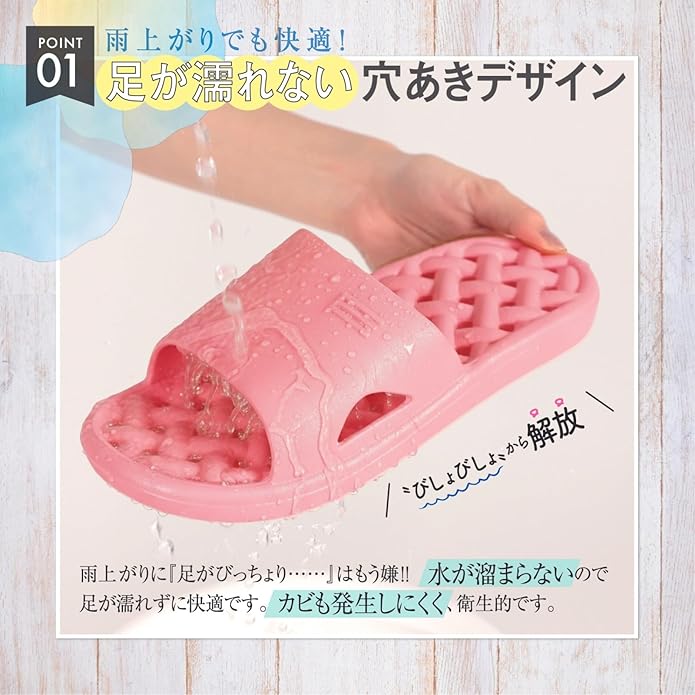 ※PVC素材は色ムラや発色差が出やすい特性がありますが、強さと耐久性に優れ、品質に問題はありません。 【水捌けが良く、足が濡れない】雨上がりにサンダルを使用すると『靴下がびっちょり......』なんて経験ありませんか?Riimosのベランダサンダルはソール全面が穴あき構造のため水捌けが良く、すぐに乾くため足が濡れません。
