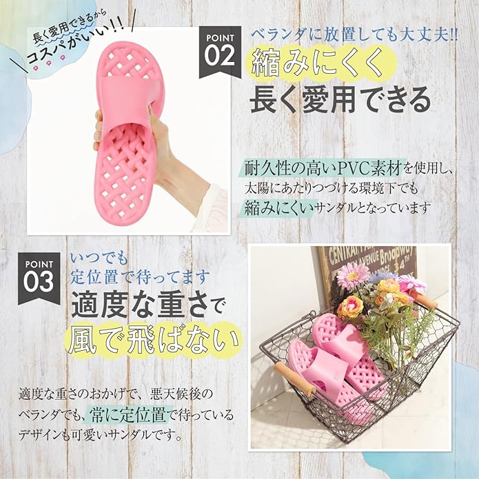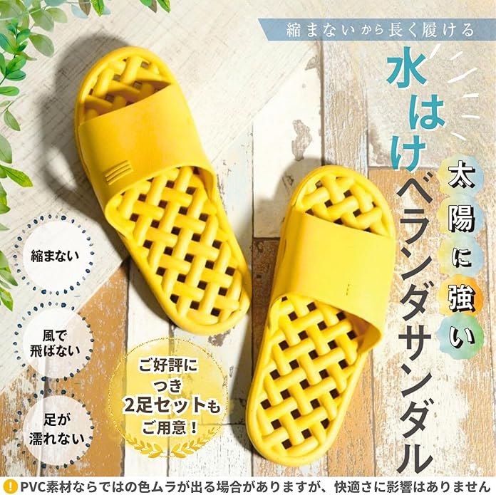 【PVC素材で、日の当たるベランダでも変形しにくい】多くのベランダサンダルに使用されているEVA素材は熱に弱く、変形やすい性質があります。当商品はPVC素材を使用し、ベランダに出しっぱなしにしていても変形しにくい仕様となっています。