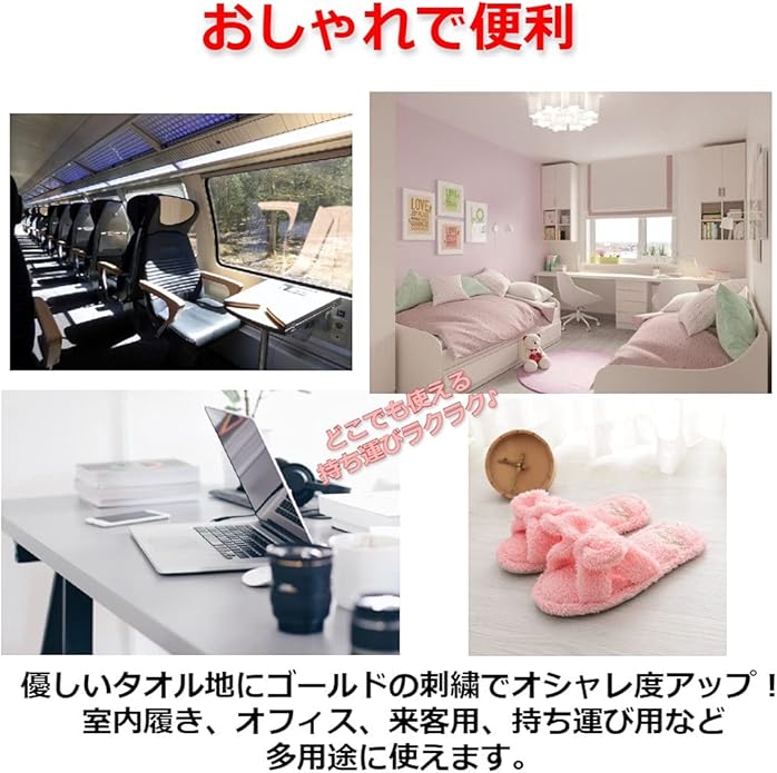 【おしゃれで便利】優しいタオル地にゴールドの刺繍でオシャレ度アップ!室内履き、オフィス、来客用、持ち運び用など多用途に使えます。