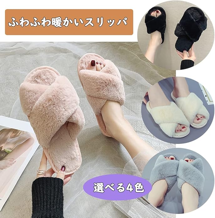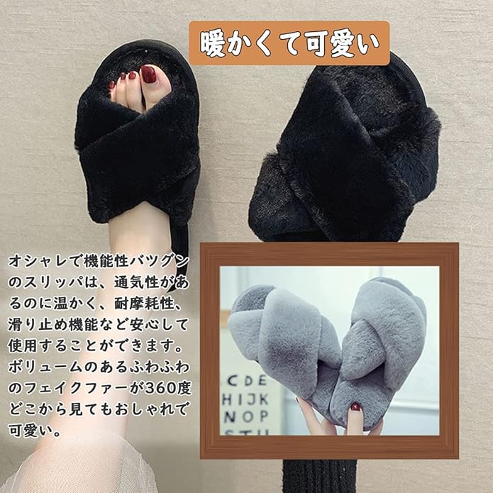 【製品仕様】グレー、ピンク、ブラック、ホワイト、4色3サイズを展開しており、おしゃれなデザインのクロス仕様、好みに合わせてご自分にピッタリな一足を選んで頂けます。ボリュームのあるふわふわのフェイクファーが360度どこから見てもおしゃれで可愛い。シンプルカラーなので毎日のコーデに合わせやすく、気軽に履けちゃう万能のサンダルです。恋人や家族とのお揃いスリッパとしてもおすすめです。