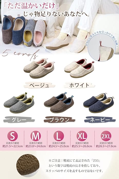 【5色展開! すっきりデザインでお部屋に溶け込む冬用スリッパ、フックに掛けて楽に収納】ホワイト・ベージュ・グレー・ブラウン・ネイビーの5色展開で、インテリアに合わせて選べる上品なデザイン。かかと部分には便利なプルタブ(引き上げヒモ)付きで、使わない時はフックに掛けて収納可能。省スペースで衛生的なのはもちろん、スリッパを置くだけでお部屋の雰囲気を崩しません。冬のくつろぎタイムを、快適でおしゃれに彩ります。