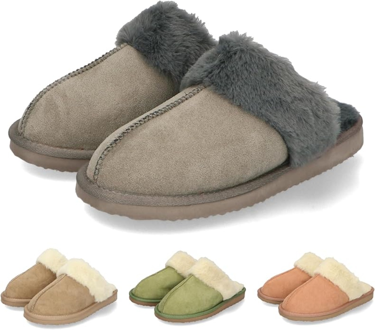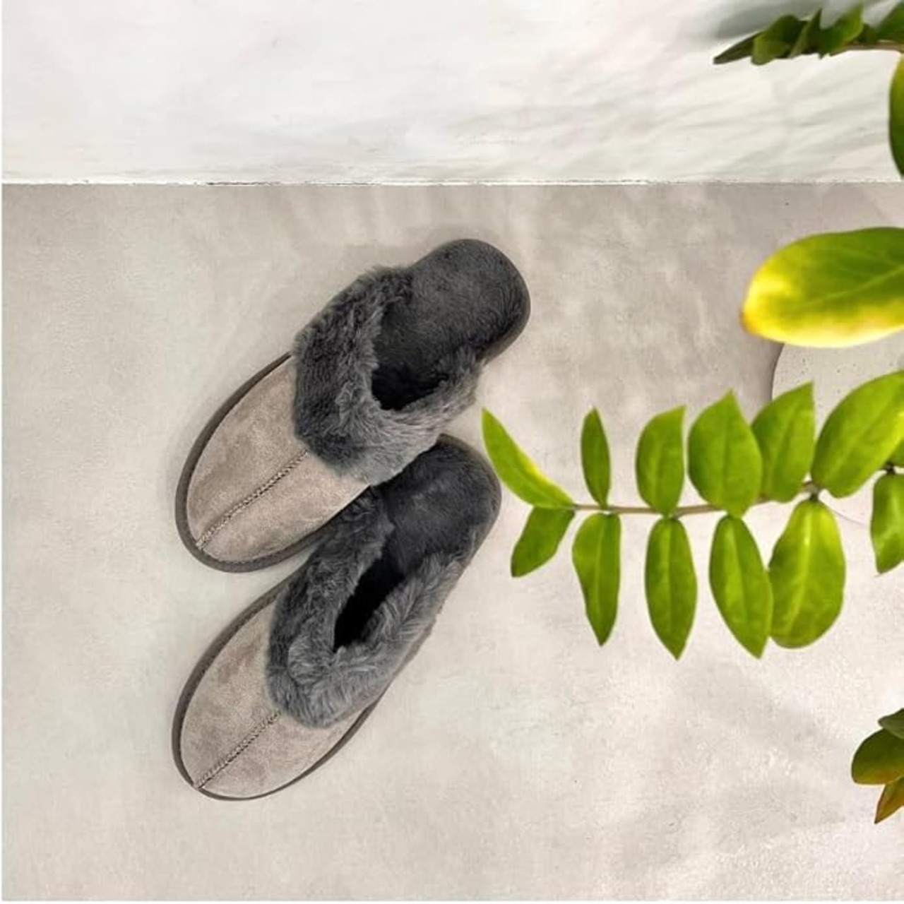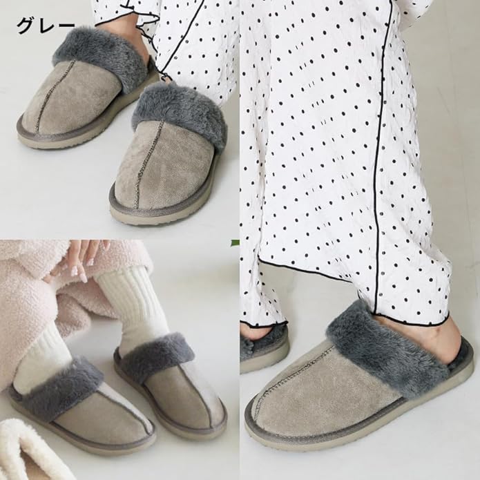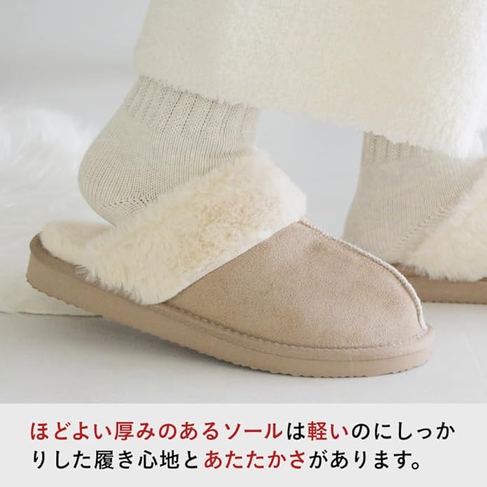 フェイクファーの肌触りが優しく、つま先まで隠れるスリッパタイプで室内も快適に過ごせるアイテム。