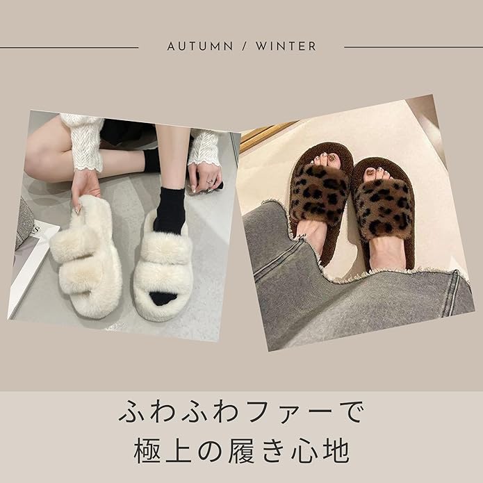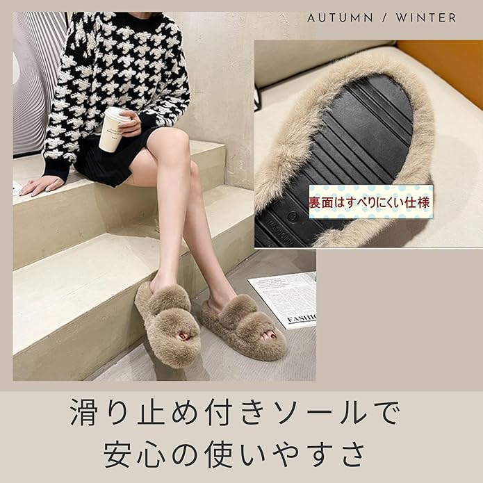 【ふわふわファーで極上の履き心地】内側は柔らかなファー素材を使用しており、足全体をふんわりと包み込みます。素足でも心地よく履けるやさしい肌触りで、おうち時間を快適にしてくれるリラックスシューズです。