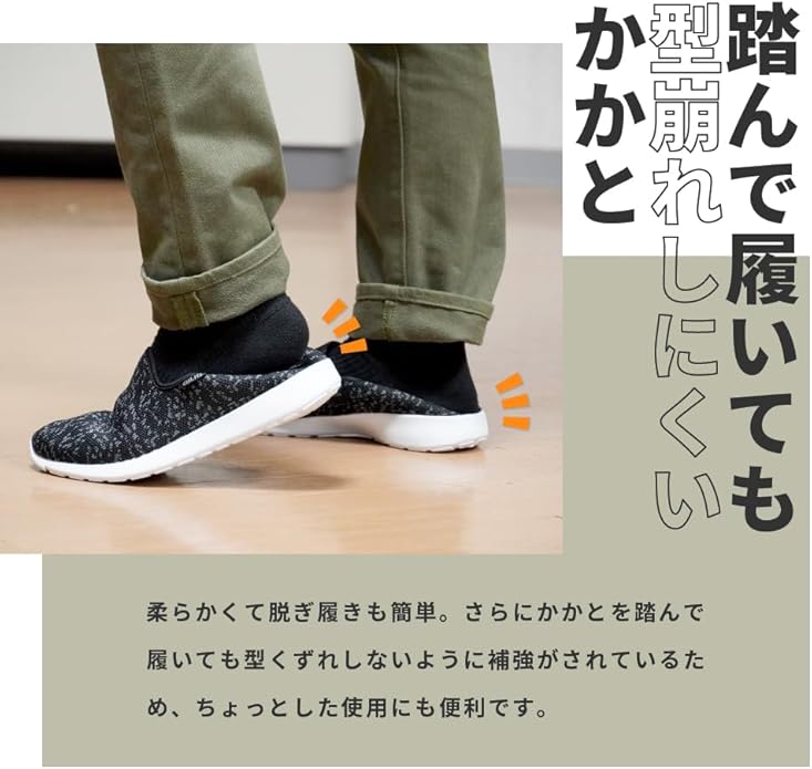 ニット素材で通気性がよく、柔らかでラフな履き心地の軽作業靴。履いている感覚がないほど柔らか。かかとを踏んで履いても型崩れしないように補強もしてあります。室内作業で床に色がつかない白い靴底を採用。