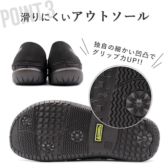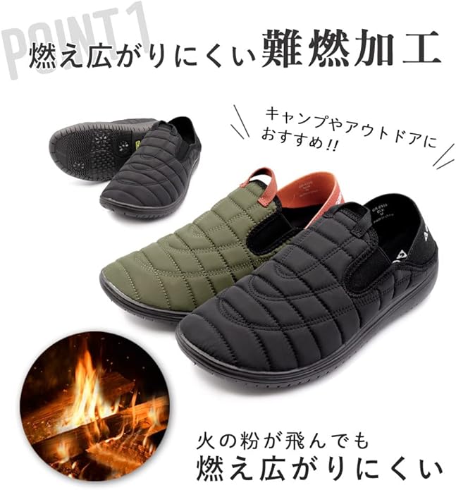 焚き火やBBQなどの火の粉が飛んでも燃え広がりにくい難燃加工が施されております。タウン履きはもちろん、カカトを踏んでも履けるのでキャンプなどのアウトドアに最適です。インソールには「もちもち」の高反発インソールを採用。軽量で脱ぎ履きが楽なおすすめのシューズです。※サイズに関して:25cm=S、26cm=M、27cm=L、28cm=LLとなっております。