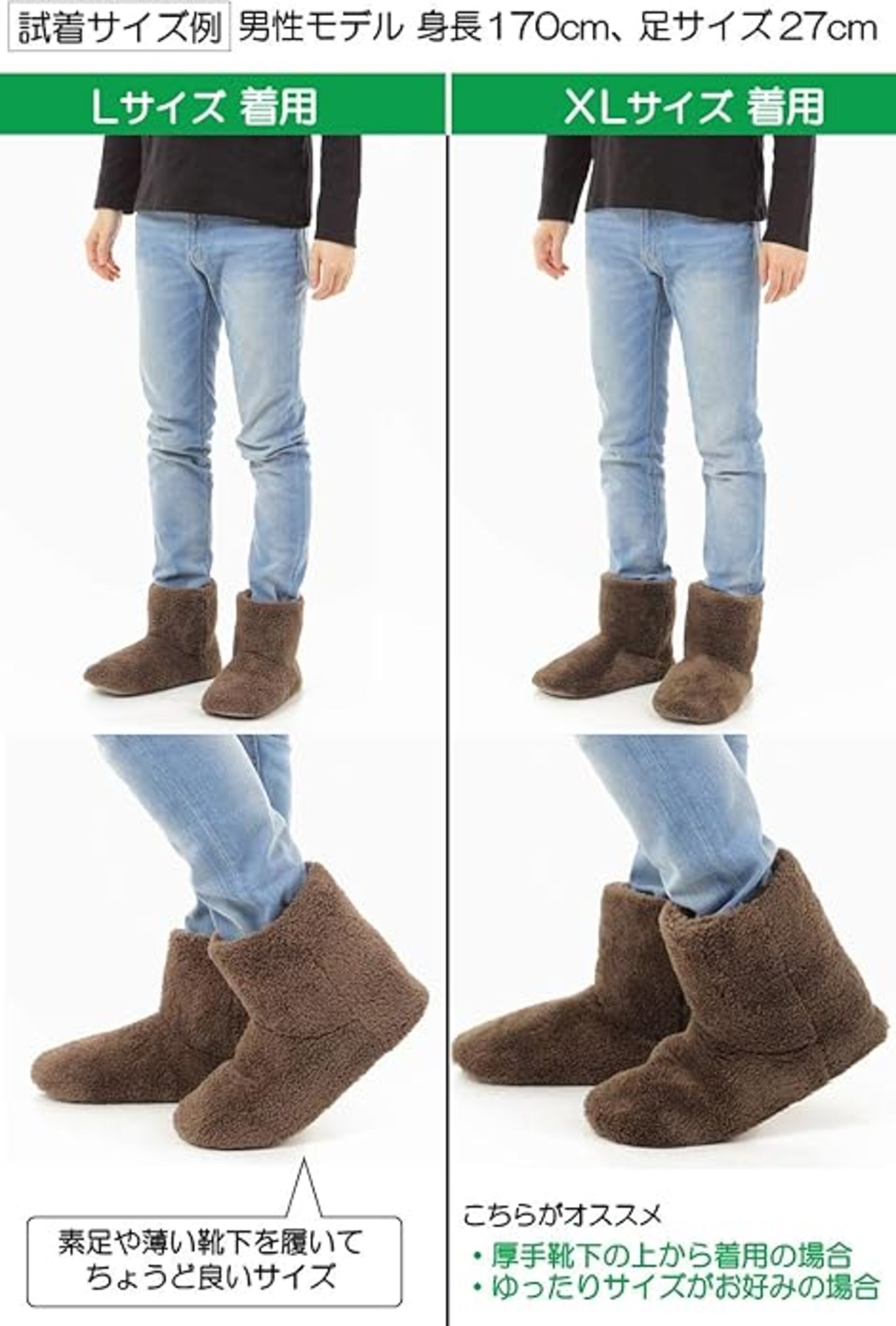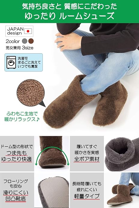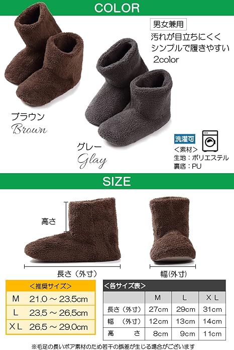 【日本人の足に合った形状】日本人の足に多い甲高・幅広に合うようルームシューズの形状を改良致しました、男性の方が履いたときにつま先や甲に違和感のないよう何度もサイズを見直し研究致しました。 【リラックスできる暖か素材】ふわふわ、もこもことしたボア素材は柔らかく脱ぎ履きもしやすく快適に、外側の素材だけでなく内側にもこだわりより暖かさを感じていただけるよう素材改良しました、素足で履いても暖かいのでリラックスでき防寒対策にも。 【洗濯機で洗えていつでも清潔】洗濯機で丸洗いできるのでいつでも清潔にお使いいただけます。洗濯の際には洗濯用ネットをお使いください。色落ちすることがありますので他のものと分けて洗ってください。 【滑り止め付き】従来よりも凸凹の細かい滑り留めを採用することでより滑りにくく改良いたしました。靴底にEVA素材の中敷を入れることで歩いたときにクッションとなり床付き感が少なく快適です、消音効果もあります。 【シンプルデザイン】男性・女性どちらも履いて頂けるシンプルなデザイン、サイズについての目安 Mサイズ:21~24cm、L:24~27cm XL27~30cm