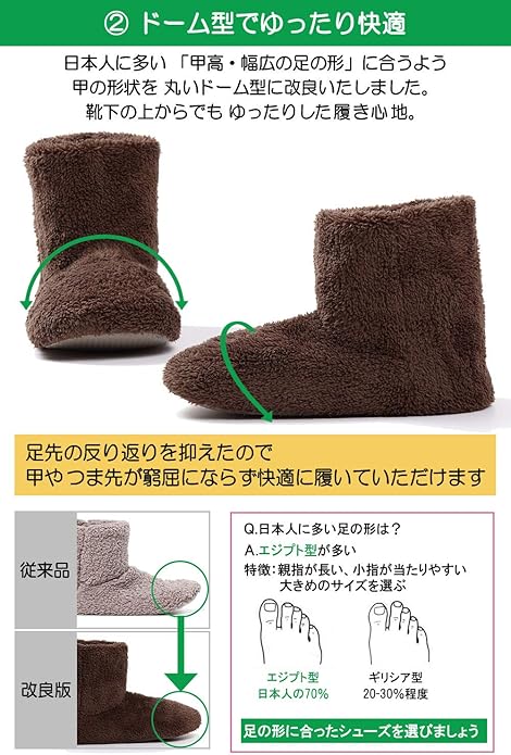 【日本人の足に合った形状】日本人の足に多い甲高・幅広に合うようルームシューズの形状を改良致しました、男性の方が履いたときにつま先や甲に違和感のないよう何度もサイズを見直し研究致しました。