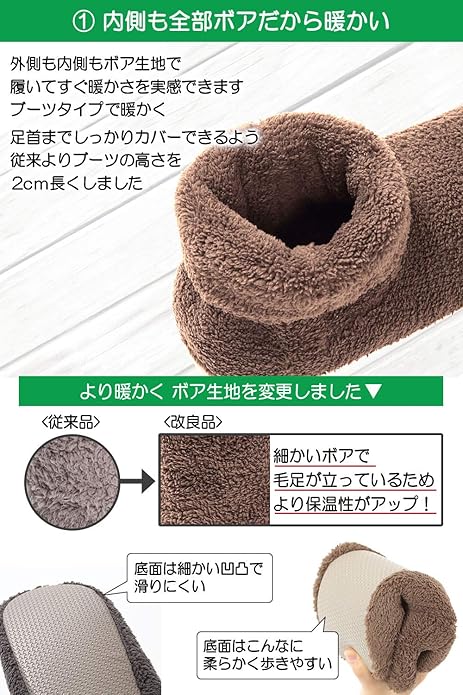 【リラックスできる暖か素材】ふわふわ、もこもことしたボア素材は柔らかく脱ぎ履きもしやすく快適に、外側の素材だけでなく内側にもこだわりより暖かさを感じていただけるよう素材改良しました、素足で履いても暖かいのでリラックスでき防寒対策にも。