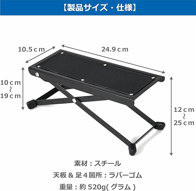 【製品サイズ・仕様】折りたたみ時のサイズ:長辺29.6cm 短編11.8cm 厚さ20mm 使用時高さ:10cm〜25cm程度に調節可能 重量:520g(グラム)