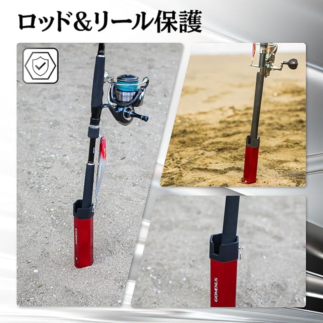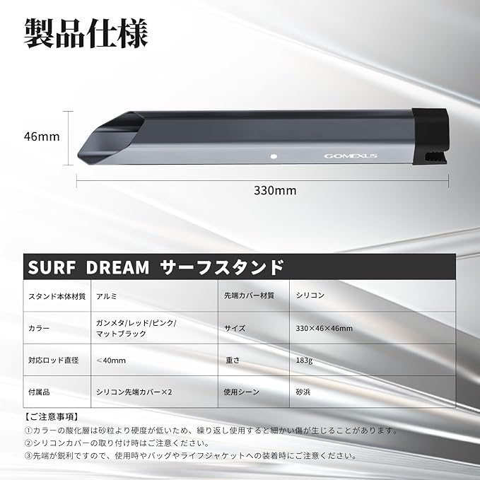 【製品仕様 】 本体サイズは330 46 46mm、重さはわずか183g。軽量アルミ製で持ち運びやすく、砂浜での設置・移動もラクラク。サーフフィッシングに最適です。