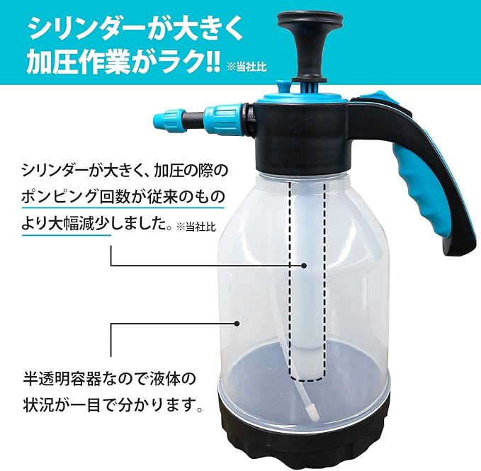 シリンダーが大きく加圧の際のポンピング回数が従来のものより大幅減少(当社比)。