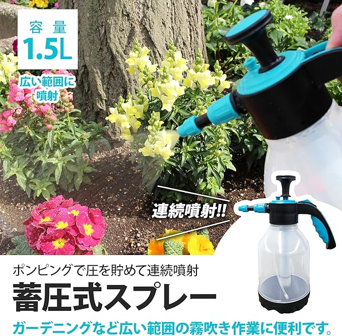 ポンピングで圧を貯め、その圧でミストを連続噴射できる蓄圧式のスプレー。