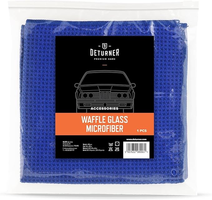 DETURNER ワッフルガラスクロスは、プロフェッショナル仕様の高性能クリーニングクロスです。2枚入りのセットで、フロントガラス、窓ガラス、サイドミラーなどあらゆるガラス面の清掃に最適です。 特殊なワッフル織り構造により、優れた吸水性と高い吸着力を実現。拭き跡を残さず、スムーズでクリアな仕上がりを可能にします。マイクロファイバー素材が細かなホコリや汚れまでしっかりキャッチし、洗車や日常のメンテナンスを効率化。 コーティング施工店でも推奨されている品質で、ご家庭でもプロレベルの仕上がりを手軽に再現できます。窓ガラスの清掃作業がより簡単に、そして快適になり、常にクリアな視界を保つことができます。
