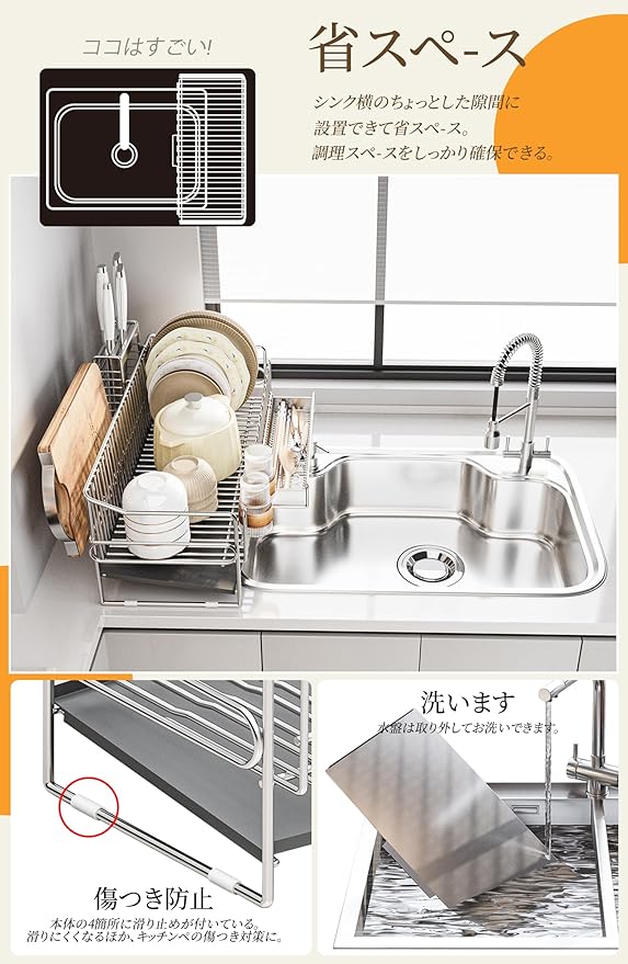 限られたスペースに対応:小さなキッチンでスペース不足に悩む方に最適。ADBIUのスリムなデザインは、シンク上の空間を有効活用し、狭い環境でも収納力を発揮します