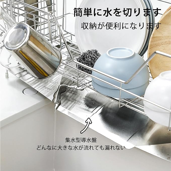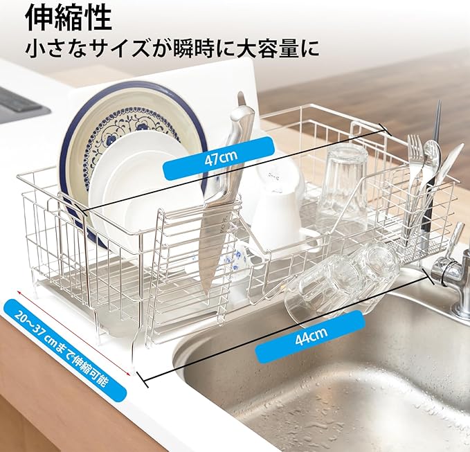 伸縮式水切りかごの幅(20cm〜37cm) 奥行47cm を自由に変更できます、カップや食器や様々なキッチン用品の収納に適しています。移動可能のカトラリーホルダーが付いて、箸、スプーン等にもお手軽に収納できます。食器 水切りには、さまざまな食器やカトラリーをすっきり収納できる。