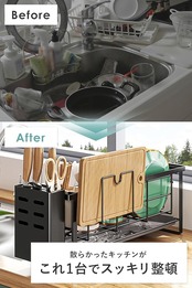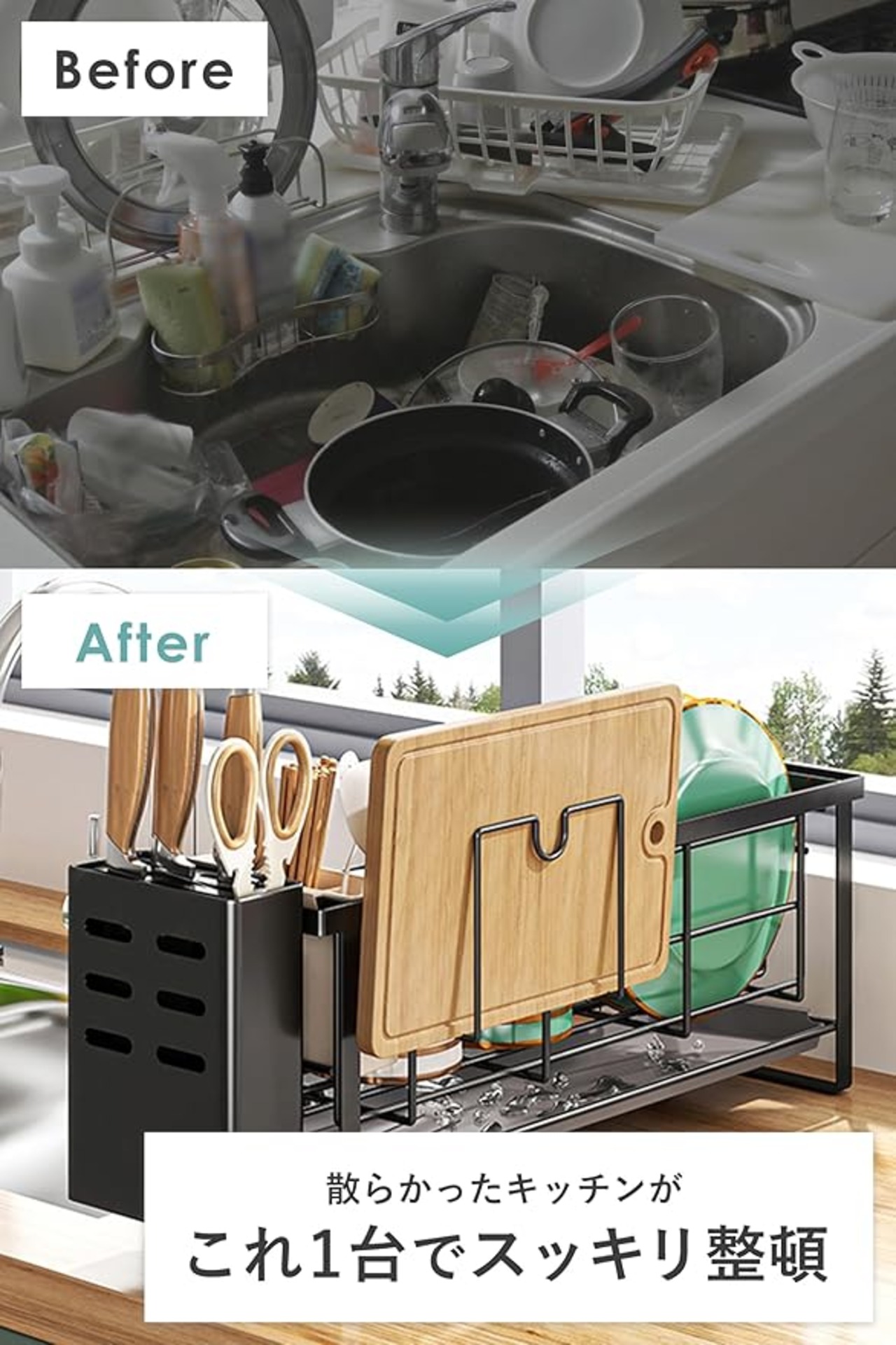 ✅【包丁・箸などのカトラリー収納もこれ一台】 包丁スタンドと箸立てホルダーが付属しており、食器だけでなく調理器具もひとまとめに収納可能なキッチンラック。散らかりがちな調理道具をスマートに整理できるのがポイント。これさえあれば、キッチンが一気に整う水切りラックです。