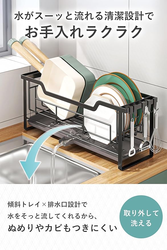 ✅【水受けトレー付きで清潔をキープ】 この水切りラックの底面には排水トレーを設置。水がそのままシンクへ流れる構造で、ぬめりやカビの発生を防ぎます。トレーは簡単に取り外して洗えるので、常に衛生的。気になる水はねや汚れを防ぎ、清掃の手間も大幅に軽減します。