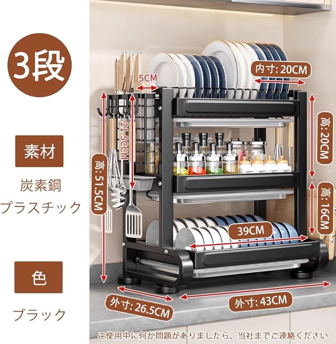 水切りラック 食器 水切り かご 大容量 キッチン ラック 多機能収納 省スペース 組立簡単 ブラック 3段 幅43*奥行26.5x高51.5CM