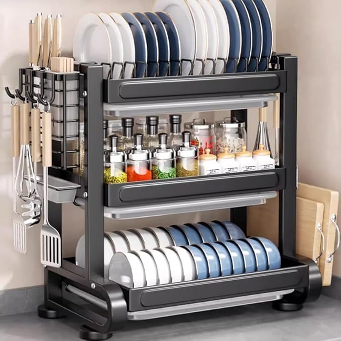 【3段大容量水切りラック】より多くの食器や皿を収納できます。箸立て、まな板立て、包丁立て、フックなどの付属品が付いています。日常生活で使用するあらゆるキッチン用品を収納し、家族全員のニーズに応えます。