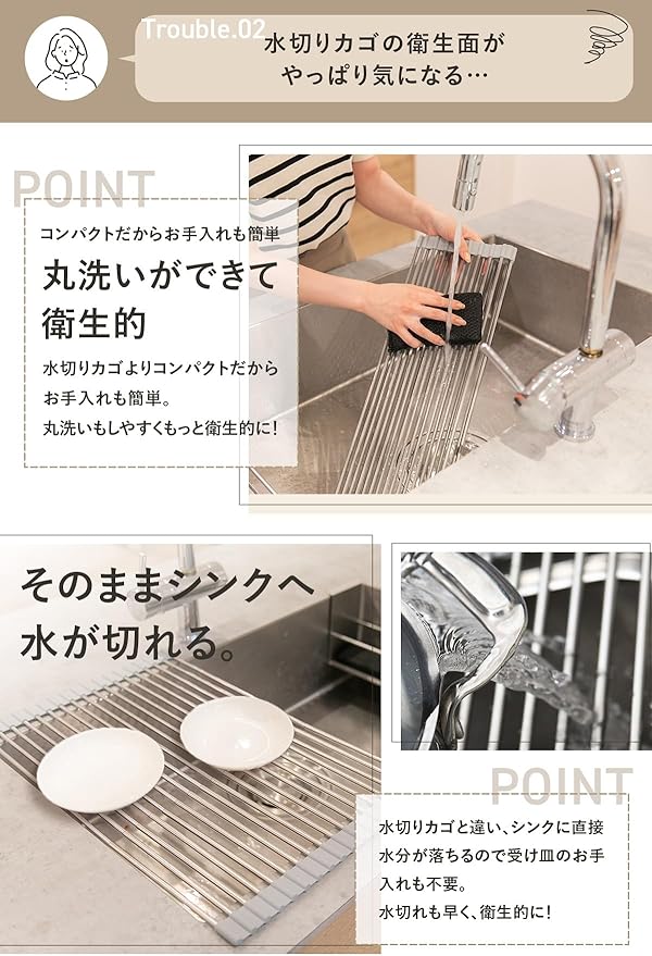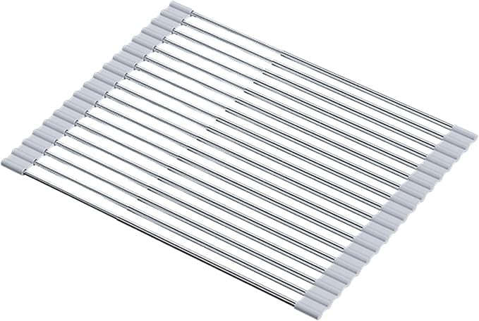 ✅【丸めて収納できるロール式で省スペース】 使用しないときはクルッと巻いて収納できるロールタイプの水切りラック。シンクの上に広げて使えるので、調理スペースの確保や水切りに便利です。使い終わったら丸めて引き出しや隙間にすっきり収納可能。キッチンを広く清潔に保ちたい方に最適な省スペース設計の水切りラックです。