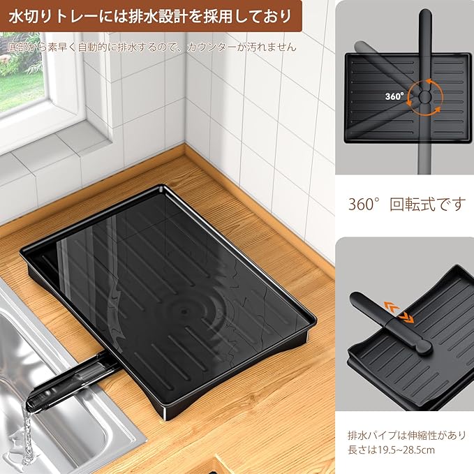 【スタイリッシュな外観と実用的な設計】水切りトレーには排水設計を採用しており、水を排水パイプから自動的に排出することができます。排水パイプは伸縮性があり、360 回転式で、カウンターを清潔に保つことができます。また水切りトレーは洗うことができます。