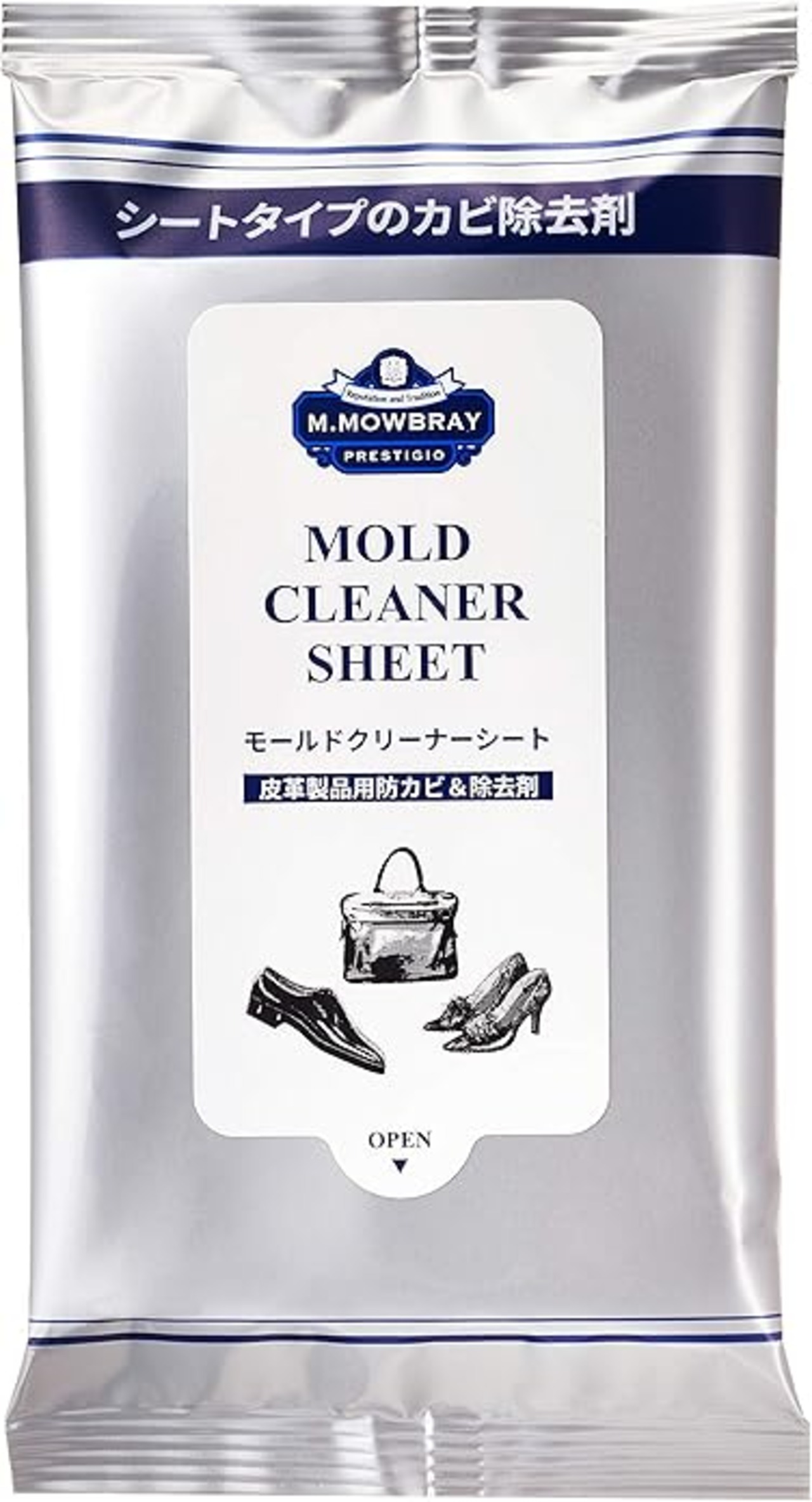 人気商品【モールドクリーナー】に使い捨てのウェットシートタイプが登場です。●用途:スムースレザー(表革)の靴、パンプス、ブーツ、スニーカー、サンダル、バッグ、ベルト、財布、手帳等 ●使用法:・シートを一枚ずつ取り出してご使用下さい。・モールドクリーナーシートで皮革製品の表面を軽く拭いてください。・靴の中も軽く拭くのおがオススメです。・まだカビが残っているようでしたら数回、新しいモールドクリーナーシートを一枚取り出して表面を拭く作業を繰り返してください。・5~7日間風通しのいい日陰で保管してください。カビが多い場合はモールドクリーナーシートで拭いた後で別売りの【M.モゥブレィ プレステージ モールドクリーナー】をご使用頂くとより効果的です。・使用後は必ず手を水で良く洗ってください。●注意:※スエード、ヌバック等の起毛皮革製品やヌメ革及び爬虫類革には使用できません。※モールドクリーナーシートを使用しても皮革製品の保管場所の湿気や温度等の環境によってはカビが再発する可能性があります。※シミや色落ちする比較もございますので予め目立たないところでテストしてからご使用ください。※子供の手の届かない場所に保管してください。※使用後は乾燥を防ぐためフラップをしっかりと閉じてください。※水には溶けませんのでトイレには流さないでください。※万が一使用後に皮膚に異常を感じた場合は水で良く洗い流した後、専門医に相談してください。