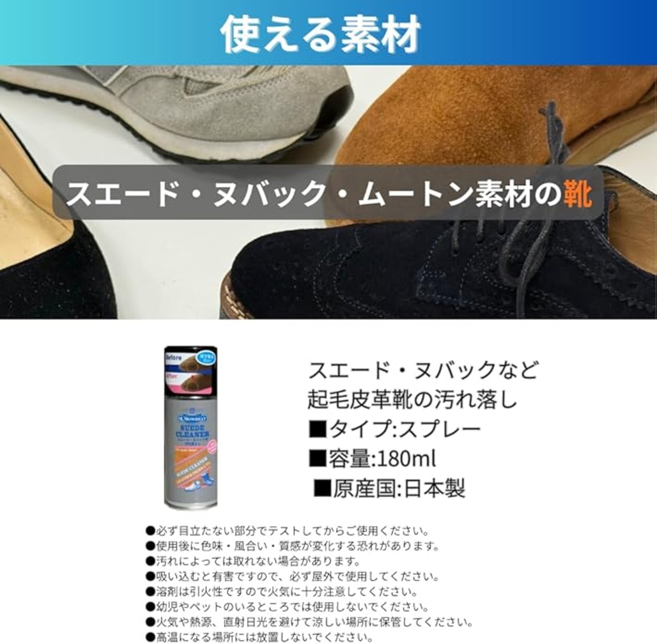 スエード・ヌバックなどの起毛皮革靴の汚れ落しスプレーです。靴の表面についた汚れや油などを除去します。靴に直接スプレーし、拭取るだけの簡易タイプです。■用途:スエード、ヌバック、ムートン(シープスキンスエード)の靴 ■タイプ:スプレー ■容量:180ml ■原産国:日本製 ■注意:用途以外の製品には使用できません。必ず目立たない部分でテストしてからご使用下さい。
