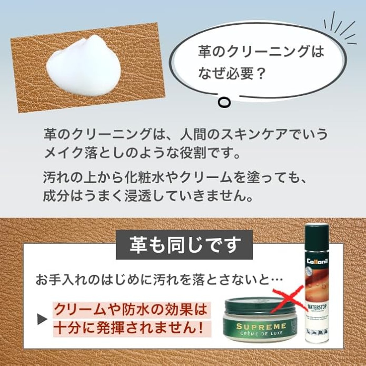 【初めての革製品ケアにもオススメ】フォーム状のクリーナーは、靴だけでなくばバッグなどの面積が大きいサイズのアイテムも簡単にケアできます。水分が少なく、塗ってもシミになりにくいため、初めて革製品をお手入れする方にもオススメです。合成皮革の製品にもご使用いただけます。※起毛皮革製品(スウェード、ヌバック、ベロア)にはご使用いただけません。