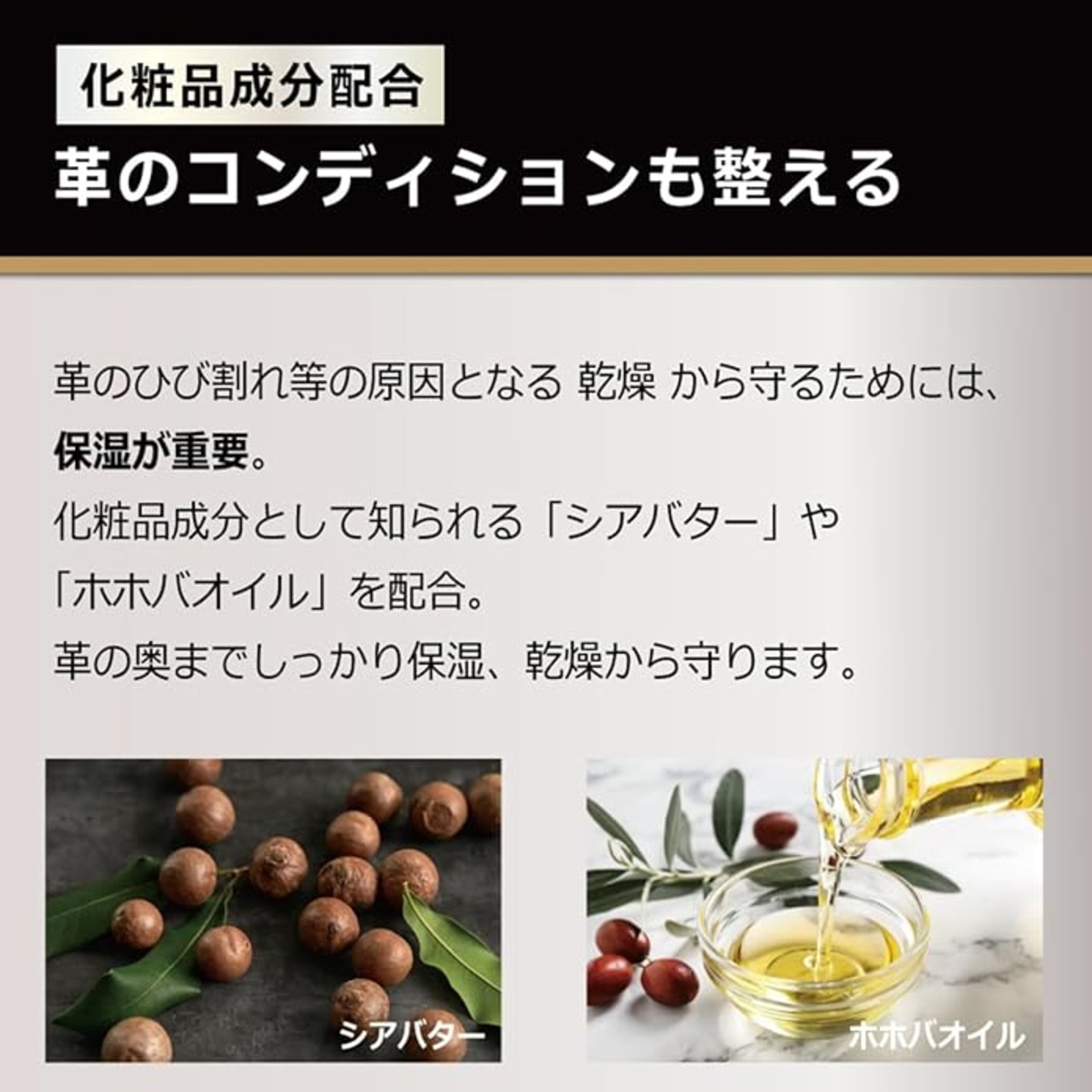 蜜蝋やシアバターは保湿効果にすぐれ、カルナバワックスが素晴らしいツヤを与える