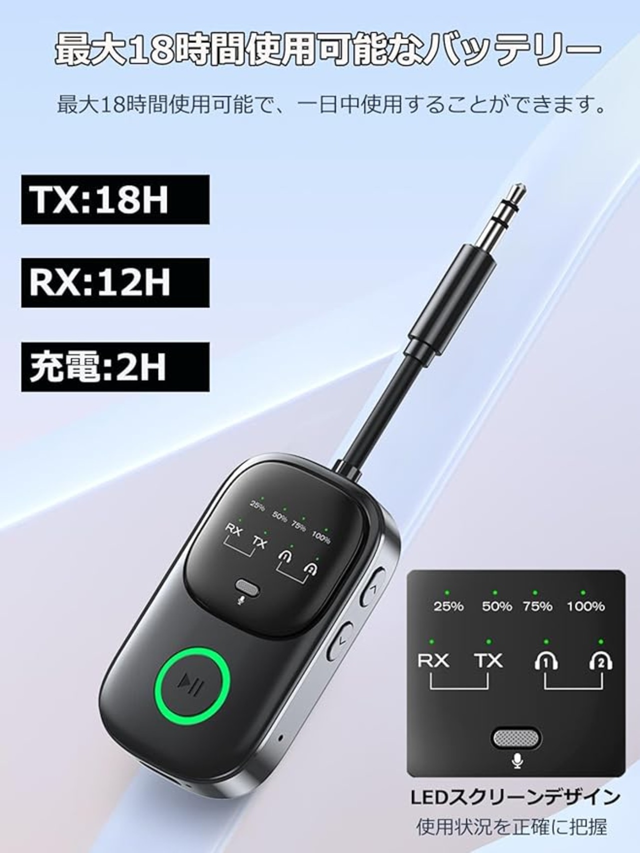 【最大約18時間再生】最大18時間使用可能で、一日中使用することができます。このデバイスは、レジャーや出張で頻繁に旅行する場合に最適なパートナーです。頻繁に充電することなく、途切れることなく音楽や通話を楽しむことができます(RX: 12H/ TX: 18H )