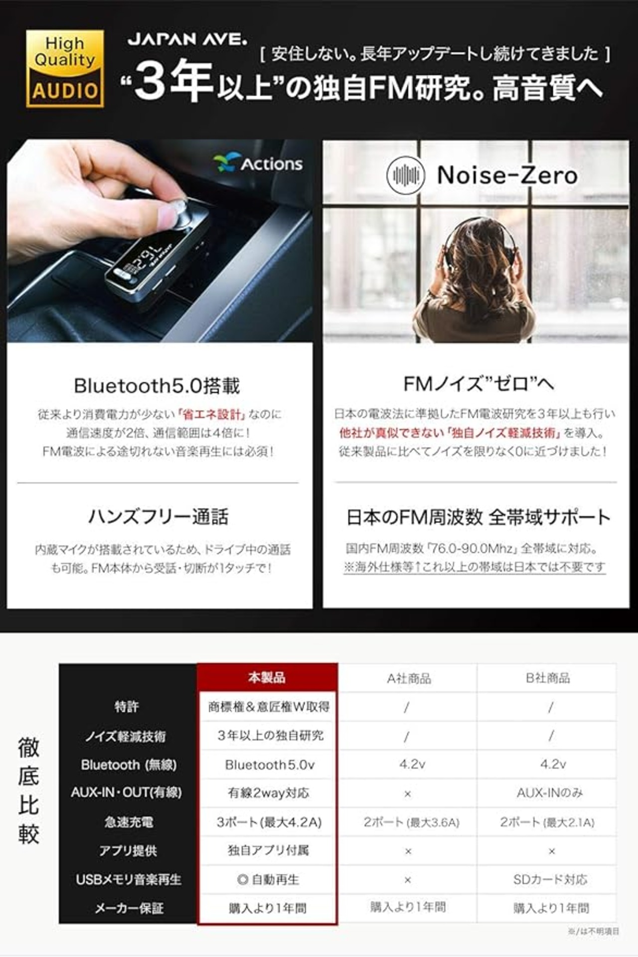 ✅【 急速充電USB 3丨最大4.2A 】 音楽再生しながら、iPhoneやiPadを "最大4.2A" の急速充電かつ "最大3台" まで同時充電が可能。Googleマップ、Youtube動画など、商品電力が激しいアプリ使用中でも、電池残量を気にすることなく急速充電が可能です ✅【 簡単1分セットアップ 】 FM機器が初めての方でも、わずか1分で接続ができる仕様。さらに、2度目以降はエンジンONで自動接続される設定に調整しております。 ✅【 有線接続で音楽再生 "AUX-IN・OUT" 対応丨2way仕様 】 iPhone・iPadとの "Bluetooth接続 (無線)" はもちろん、Bluetooth非対応のiPod・ウォークマンを付属オーディオケーブルで "有線接続" して、FM無線なしでもカーオーディオから高音質での音楽再生することが可能になりました。✅【 音質改善丨より快適な音楽再生 】長年の改良でついに従来のAUX接続時とBluetooth接続時に生じる多少の音量差が大幅に改善しました。Bluetooth接続時でも有線接続時(AUX接続)とほぼ同等の音量での音楽再生を実現