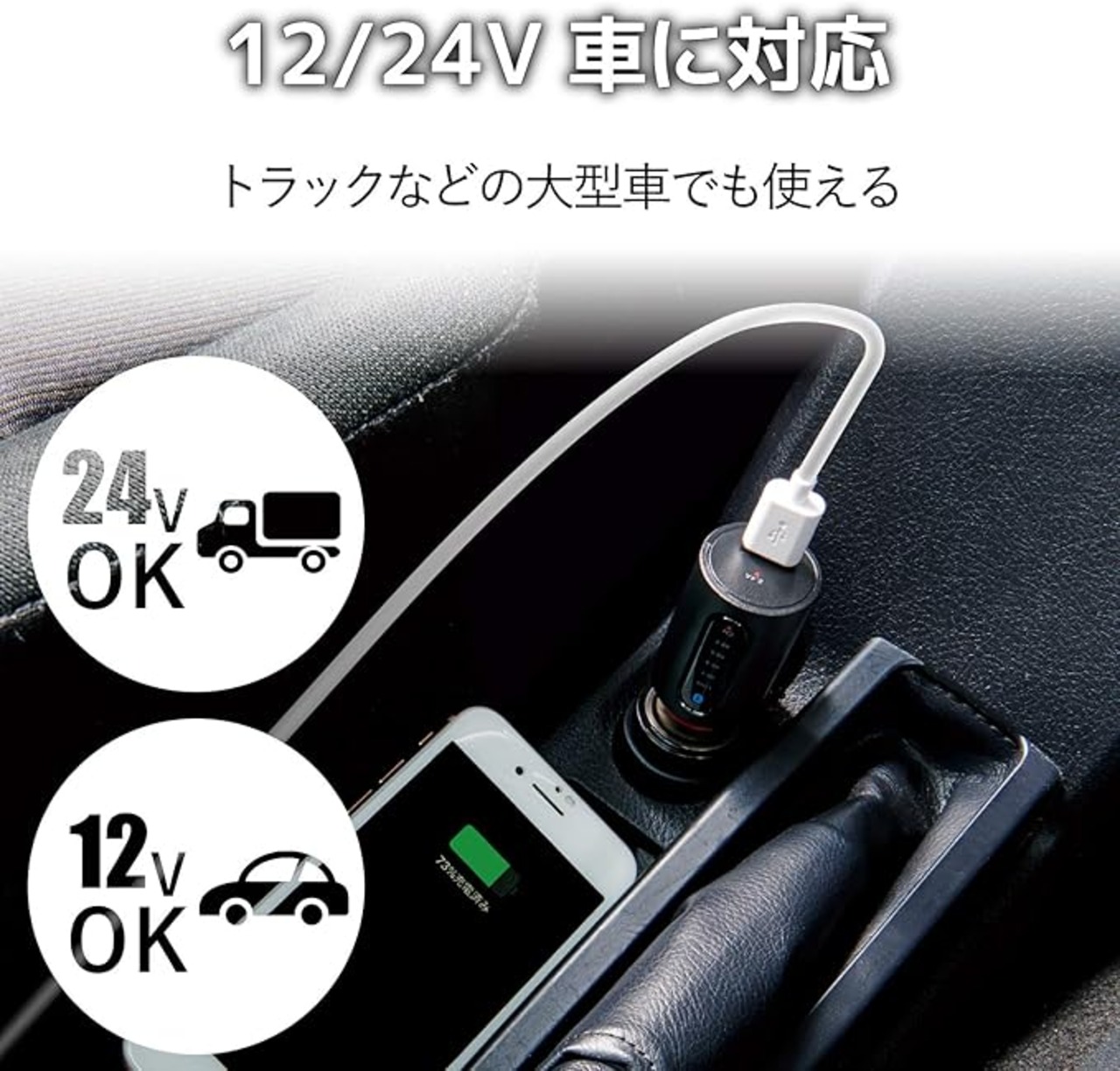 12/24V車に対応しています。トラックなど大型車でもアダプタ等を使用せず、そのまま使用することができます。