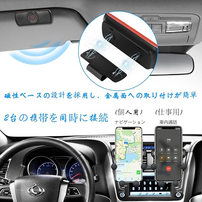 【2台の携帯を同時に接続】この車載 ワイヤレススピーカーはBluetooth V4.2+EDRを搭載し。10m内の有効なスマホのBluetoothを検索できます。動作中に2台の携帯を同時に接続できます。音楽(生活)と通話(仕事)を簡単に切り替えます。一回ペアリングが成功すると、2回目以降は自動的に携帯と接続しペアリングされます。面倒な設定はいりません!