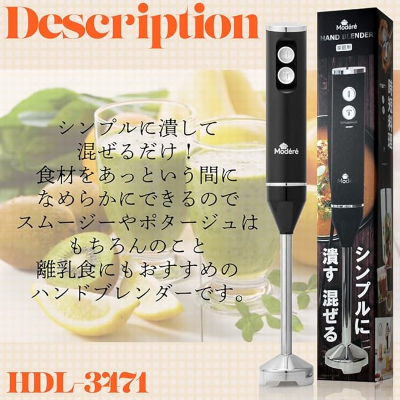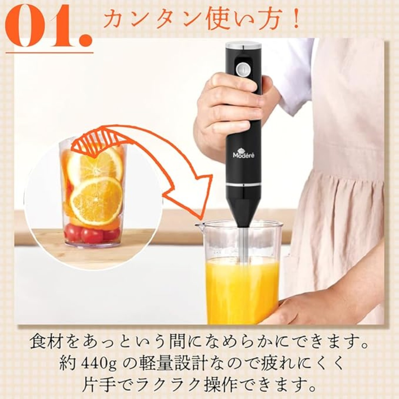 カンタン使い方! 食材をあっという間になめらかにできます。 約440gの軽量設計なので疲れにくく 片手でラクラク操作できます。