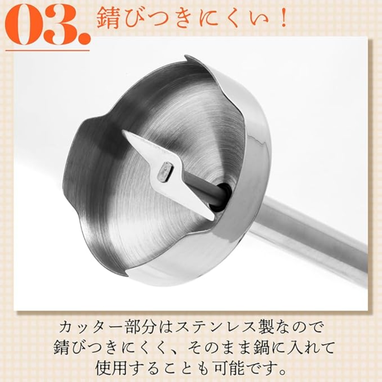 錆びつきにくい! カッター部分はステンレス製なので 錆びつきにくく、そのまま鍋に入れて 使用することも可能です。