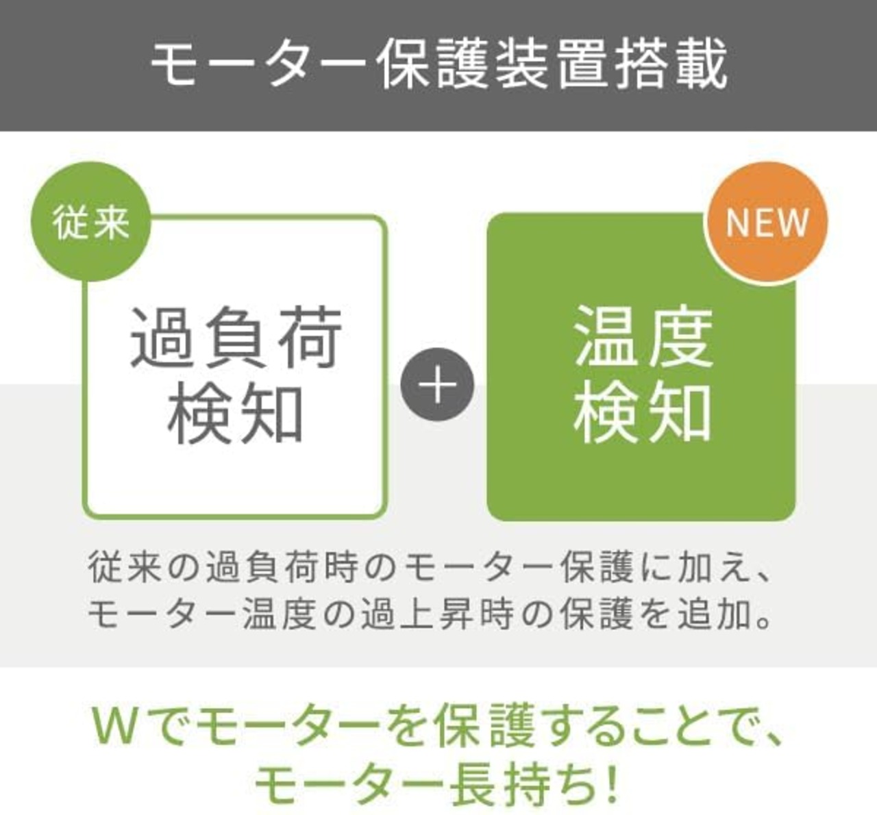 ■材料の詰め込みすぎや粘度の高い材料、固い材料による過剰な負荷からモーターを守ります。 また、従来の保護装置では対応していなかった連続使用で生じる発熱からもモーターを守ります。