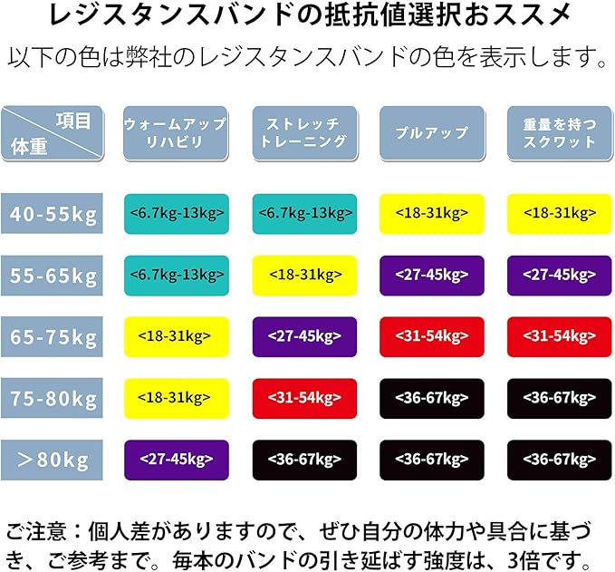 【5階段負荷のレジスタンスバンド 最大負荷67kg調整可能】:緑(6.7-13kg)、黄(18-31kg)、オレンジ(27-45kg)、赤(31-54kg)、黒(36-67kg)あなたは絵の指導と個人的な訓練のに基づいて適当なレジスタンスバンドをお選びください。全身トレーニングには、黄・オレンジ・赤のセットをおススメ。腕や肩のストレッチトレーニングためにはライトレジスタンスチューブをおススメ。足のスクワットまたは引き上げの高難度なトレーニングにはより強いレジスタンスチューブにおススメ