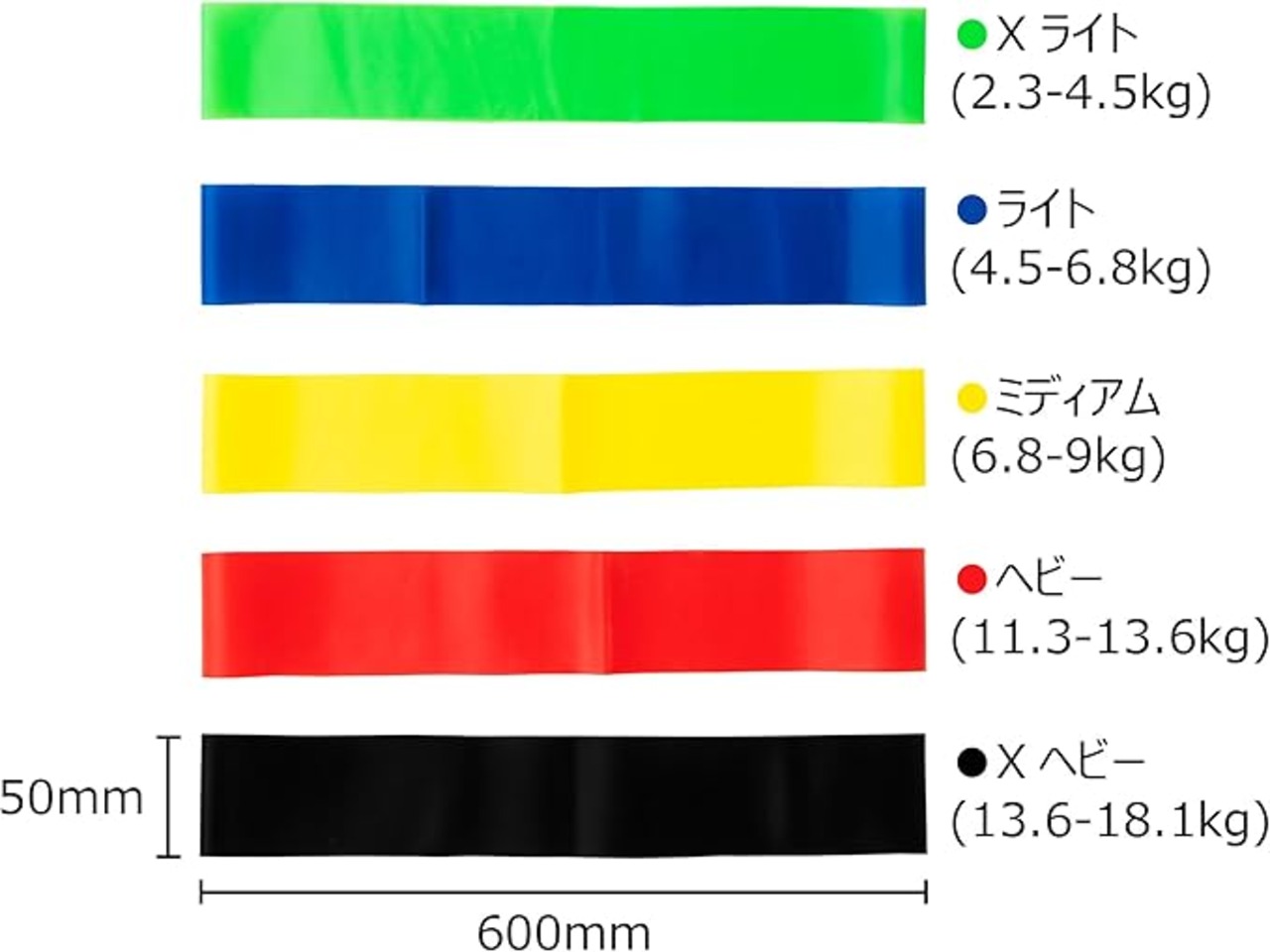 抵抗 : グリーン-Xライト(5-10lbs,2.3-4.5kg)/ブルー-ライト(10-15lbs,4.5-6.8kg)/イエロー-ミディアム(15-20lbs,6.8-9kg)/レッド-ヘビー(25-30lbs,11.3-13.6kg)/ブラック-Xヘビー(30-40lbs,13.6-18.1kg)