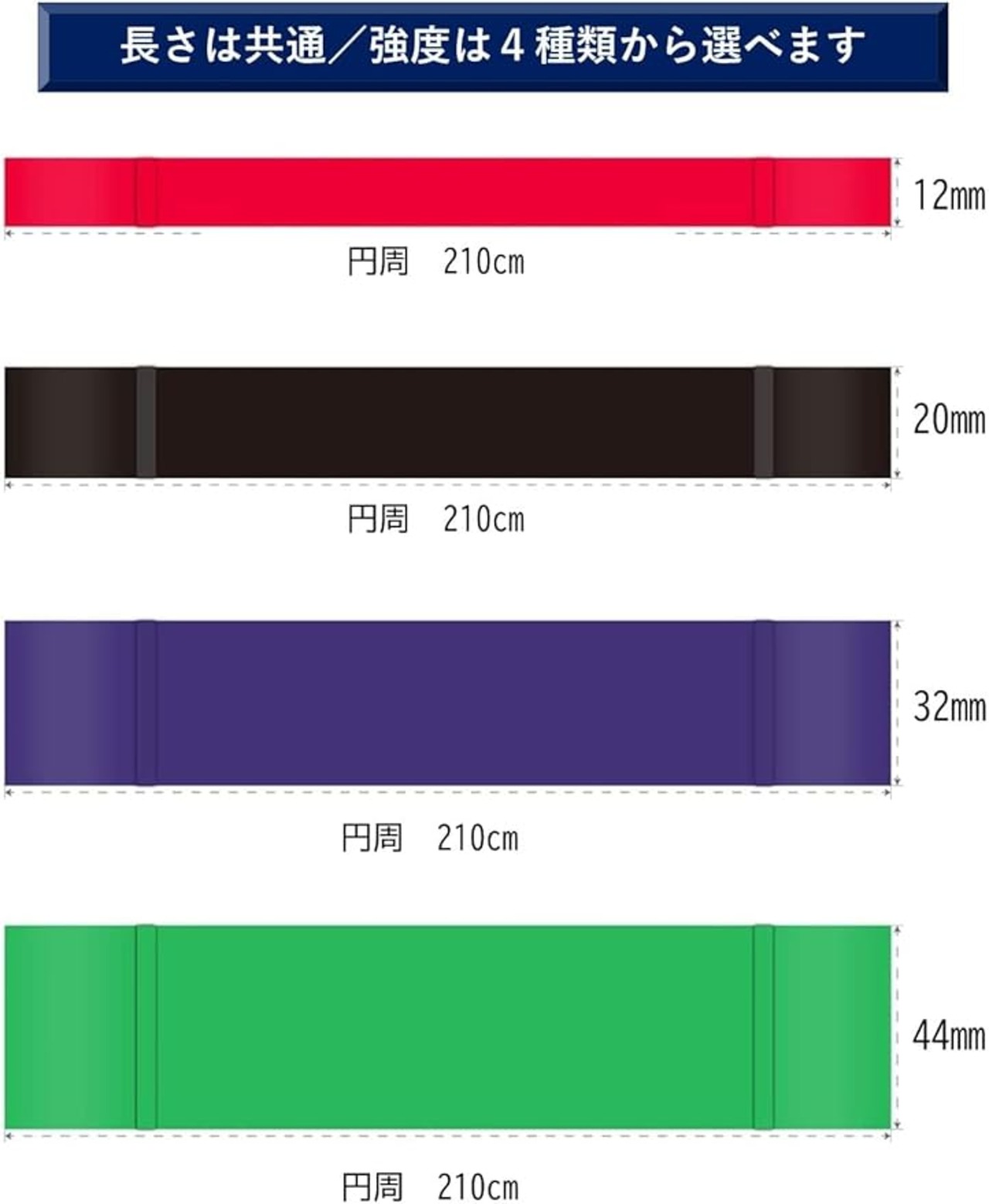 (弱)赤→黒→紫→緑(強)の4色をご用意。色で強度を区別できます。ご自身のレベルに合わせて、使い分けることでトレーニングの効果を一層高めることができます。