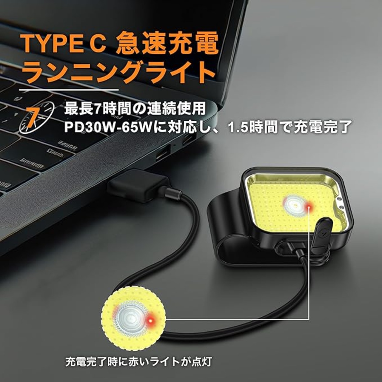 【高速Type-C充電&長時間持続】 リチウムバッテリーを搭載したナイトウォーキングライトは、低輝度モードで最大5.5時間、高輝度モードで2.5時間、赤・緑モードで最大7時間の使用が可能です。高速充電チップとPD30W-65W急速充電に対応し、わずか1.5時間でフル充電が完了。赤色LEDインジケーターでリアルタイムの充電状況を確認でき、充電中はゆっくり点滅、満充電時は点灯、バッテリー残量が少なくなると高速点滅します。充電の待ち時間を最小限に抑え、長時間のアウトドア活動にも対応可能です。
