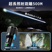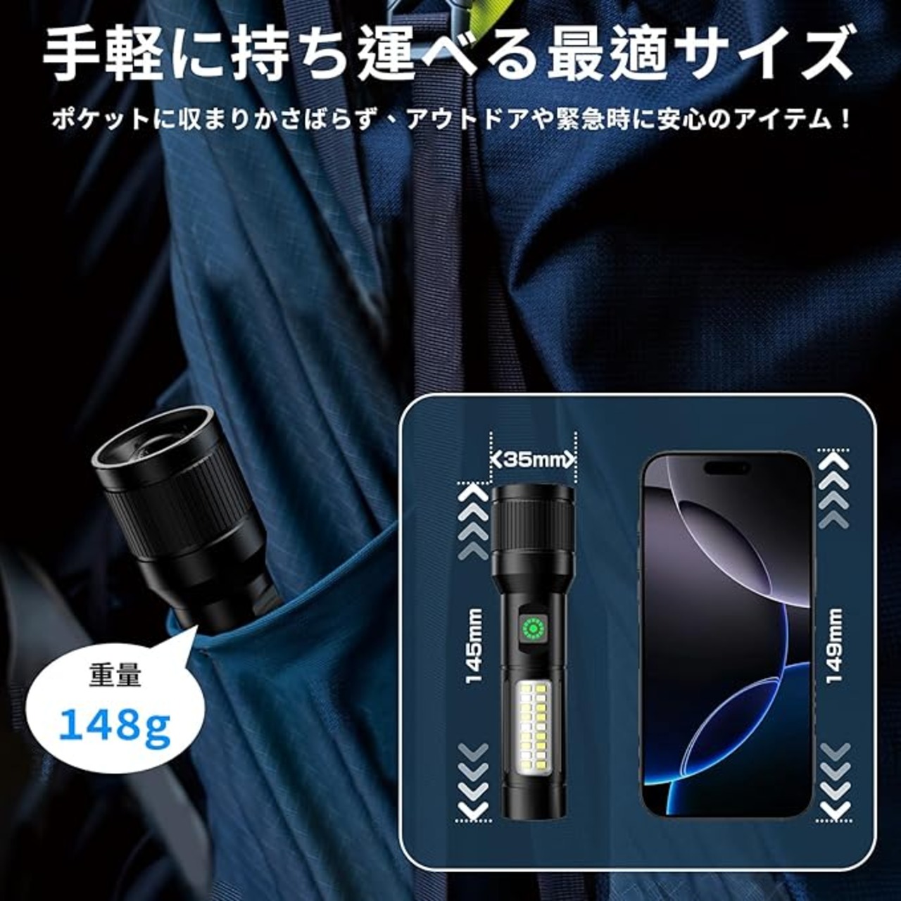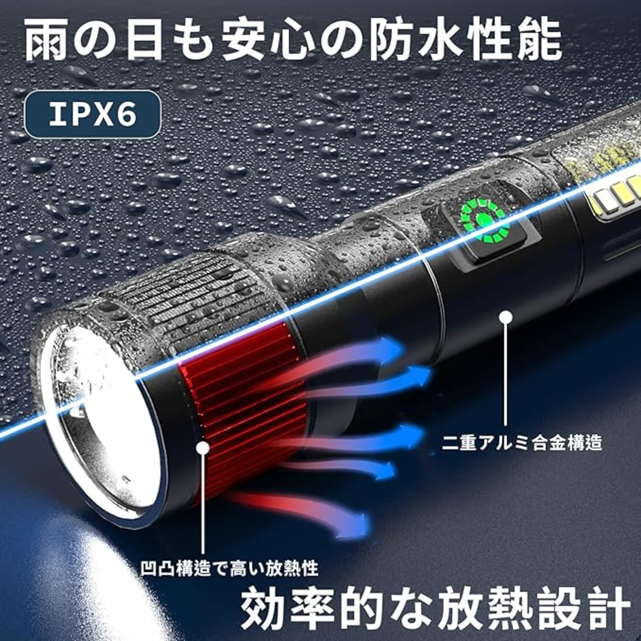 ✅【高強度LED照明で&作業用COBライト&6つの多機能点灯モード】この懐中電灯は,高輝度の LEDを搭載し、最大1000ルーメンの明るさを実現、最大照射距離は500メートルに達します、投射された光束の明るさは完全に同じタイプの懐中電灯を超えて、緊急時にはCOB赤灯の点滅でSOS信号として使用でき、安全性を向上させます。懐中電灯のヘッドを伸縮させることで焦点距離を調整し、遠距離スポットライトまたは広範囲の汎光灯を自由に選択することが可能です。