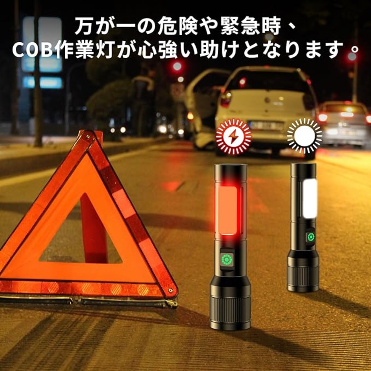 懐中電灯 【2025最新の強化版 夜光 ライト 】ハンドヘルドトーチ ledライト 白色と赤色COB作業灯/ 6モード調光/最大照射距離500m/ 大容量電池 実用点灯最大16時間/Type-C充電式/電池式スマート急速放熱 可変ズーム アルミ合金製小型耐衝撃トーチ コード付きポータブルトーチ 防水 コンパクト キャンプ/防災/屋外/登山/作業用/夜釣り/避難/停電対策