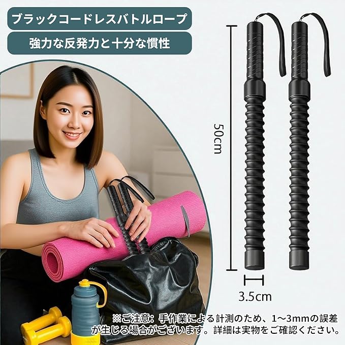 【便利なコンパクトサイズ】長さ50cm、黒色のカバーが付いたバトルロープは2本1組です。コンパクトながらも効果的なので、ホームジムでもプロのトレーニング環境でも、引き締まった筋肉質な体幹を簡単に鍛えることができます。