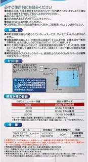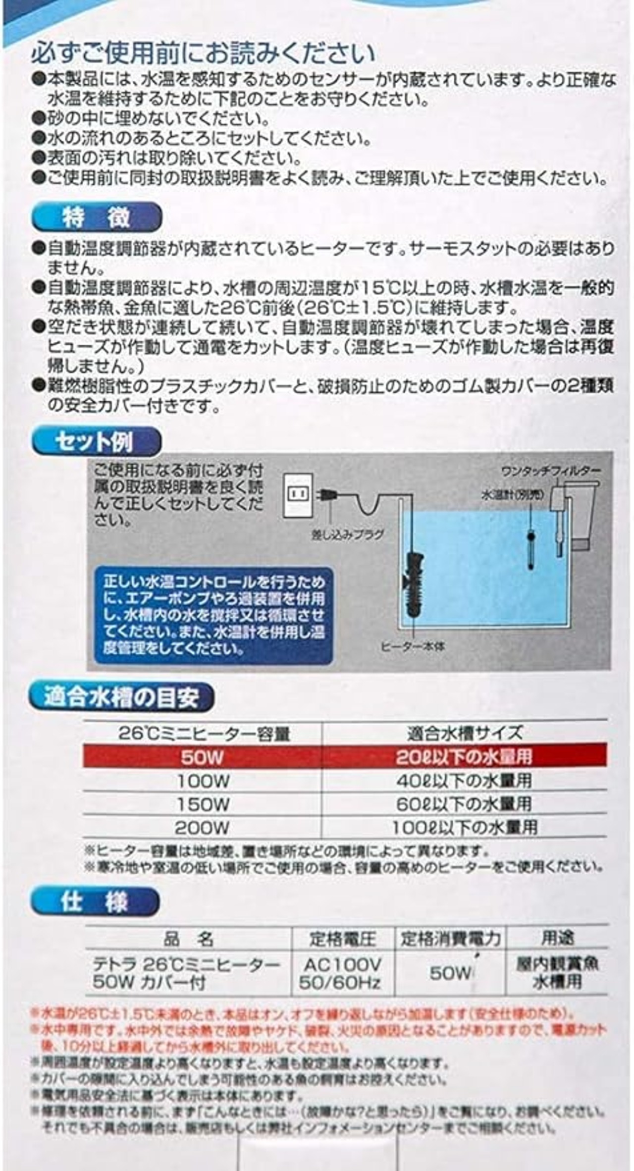 ●自動温度調節器能内蔵なのでサーモスタット不要。水温26℃前後に維持します。●空だき状態が続いて自動温度調節器が故障した場合、温度ヒューズが通電をカットします。(再使用できません。)●難燃性のプラスチッックカバーと、破損防止のためのゴム製カバーの2種類のカバー付きです。