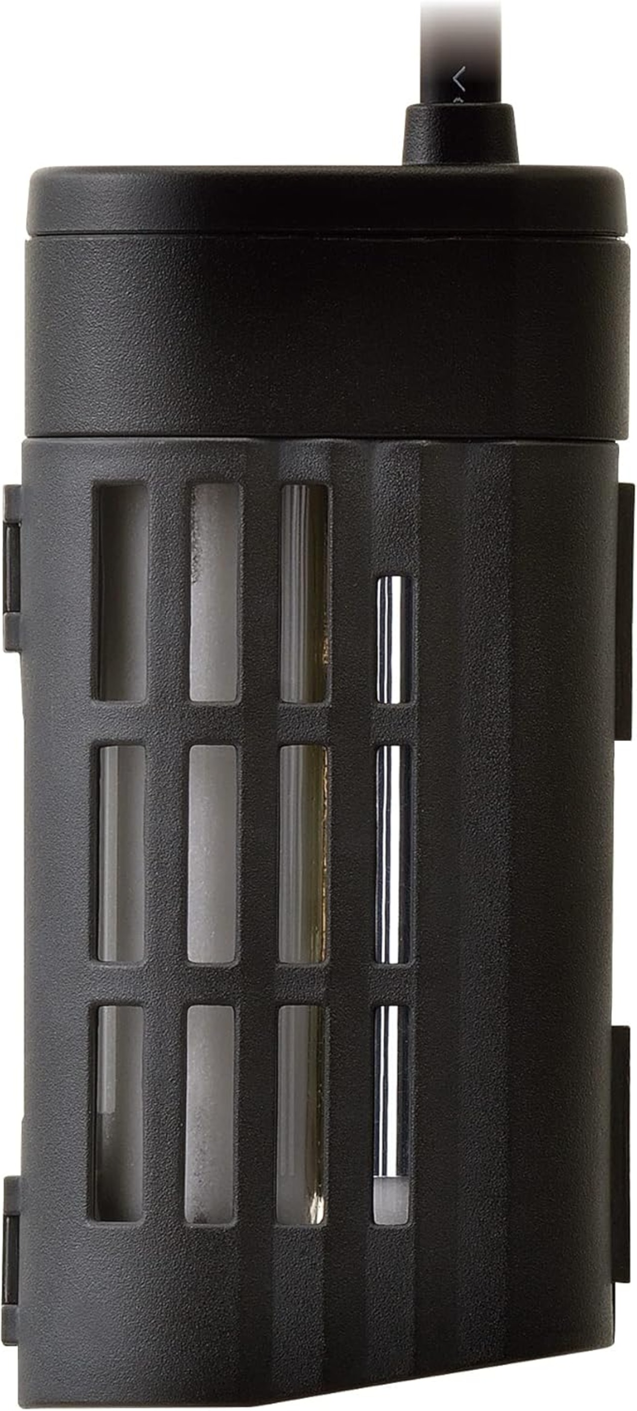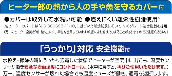 水温を23度( 1.5度)に自動保温するコンセントに差すだけのカンタンオートヒーター! サーモスタット不要! メダカの産卵・繁殖に最適な水温23度に自動保温!! 自然界のメダカは日照時間が14時間以上、水温が20度以上になる春から夏にかけて産卵すると言われています。水槽にヒーターを入れて保温することで、冬でも産卵・繁殖を楽しむことができます。 従来の横設置に加え、縦設置も可能。縦設置でも、正確に水温をコントロールする独自設計。縦・横自由にレイアウトできるから、小型水槽でもすっきり。 ヒーター管を2段にすることでコンパクト化。小型水槽にぴったり。 トラッキング対応プラグ使用。※日本ペット用品工業会 観賞魚用ヒーター品質基準適合品※ ヒーター部の熱から人の手や魚を守るカバー付! ・カバーは取り外して水洗い可能。・燃えにくい難燃性樹脂使用 ※ヒーターカバーには米国の燃焼性試験規格である「UL94」のV-0グレード適合樹脂を採用。(万一ヒーターの空焚き時に発火しにくい素材を使用していますが、熱により溶けたりすることがありますのでご注意ください) 「うっかり」対応 安全機能付 ~うっかり通電した状態でヒーターが空気中に出ても、温度センサーが働き安全な表面温度にコントロール。(水中に戻すと、再びご使用いただけます。) 万一、温度センサーが壊れた場合でも温度ヒューズが働き、通電を遮断します。 適合水槽:水容量約8L以下(水槽サイズの目安:小型水槽) ヒーターサイズ:幅4.7 長さ9.6 高さ3.8cm 電源コード長:約0.9m 定格消費電力:20W ※2年保証にはユーザー登録が必要です。