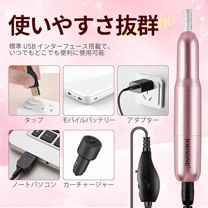 JODSONE 電動USBネイルドリル アクリル&ジェル用 14000RPM ポータブルネイルファイル Eファイルセット ネイルドリルビット 研磨バンド付き ピンク